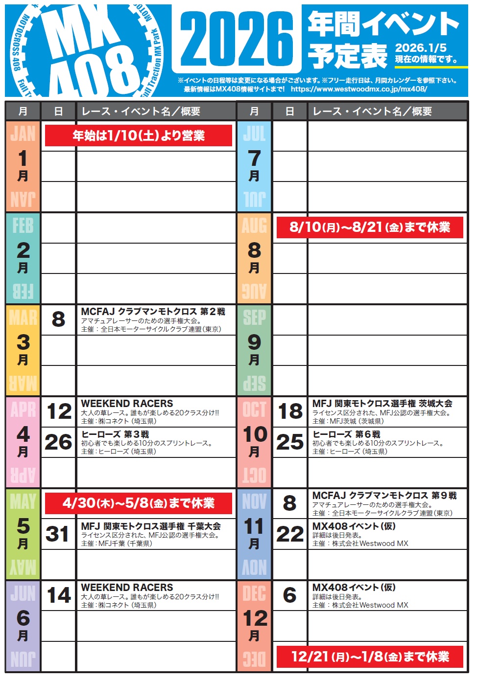 2026.01.06 MX408年間予定表 2026年間カレンダー[260106更新] MX408、年間カレンダーになります。また、11月と12月のベント(仮)のところは、正式に決定し次第アナウンス致します。