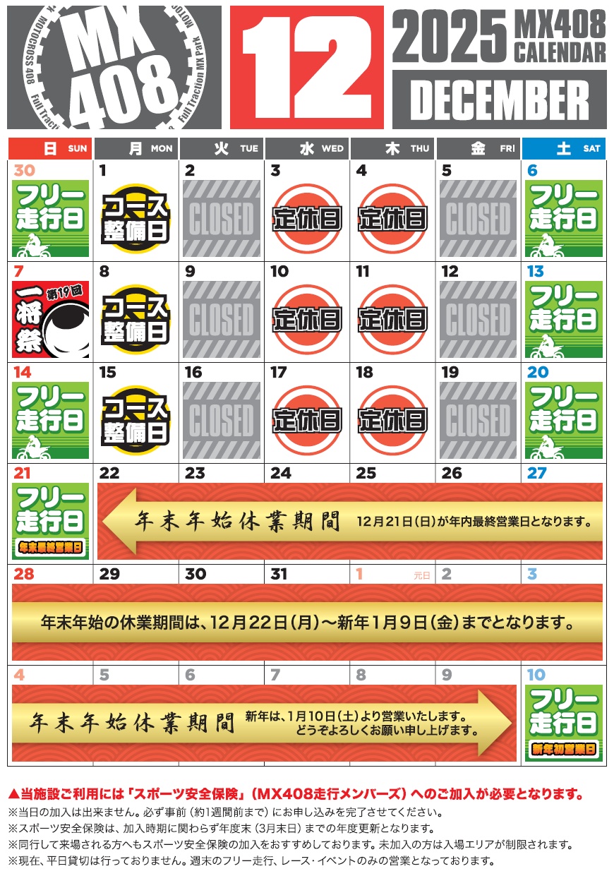 2025.11.20 MX408月間予定表 2025年12月カレンダー 12月のMX408月間カレンダーになります。 【レース開催日】・12/7(日) 第19回 一将祭 【年末年始休業】・12/22(月)~1/9(金)まで皆様のご来場をお待ちしております。