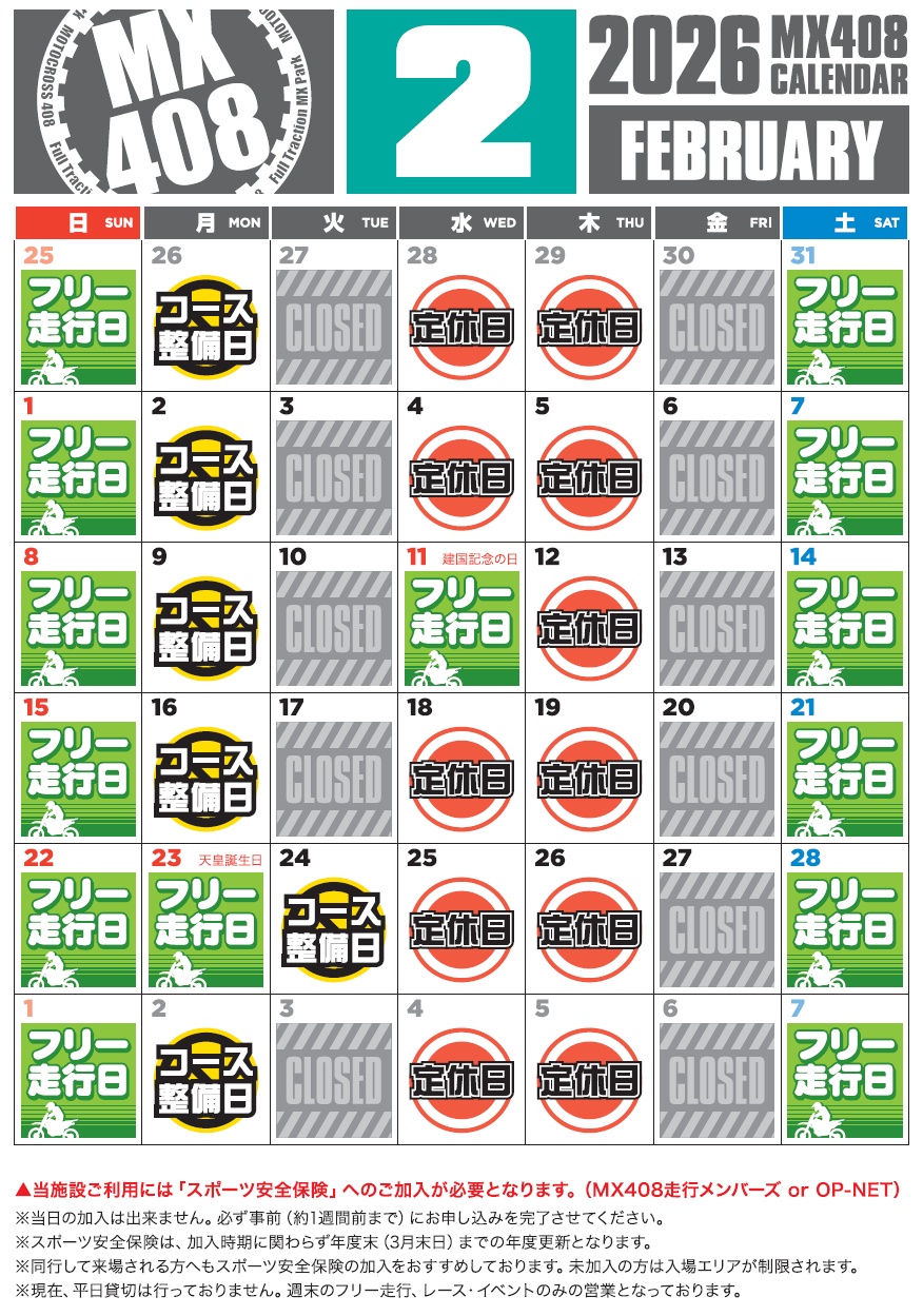 2026.01.26 MX408月間予定表 2026年2月カレンダー 2026年2月のMX408月間カレンダーになります。 2月のレース開催日はございません。また、2/11(水)、2/23(月)はフリー走行可能日となっております。 スタンプラリーも開催中ですので、皆様のご来場をお待ちしております。