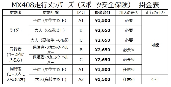MX408では、安全上の観点から、走行するためにはスポーツ安全保険ご加入が必須となります。